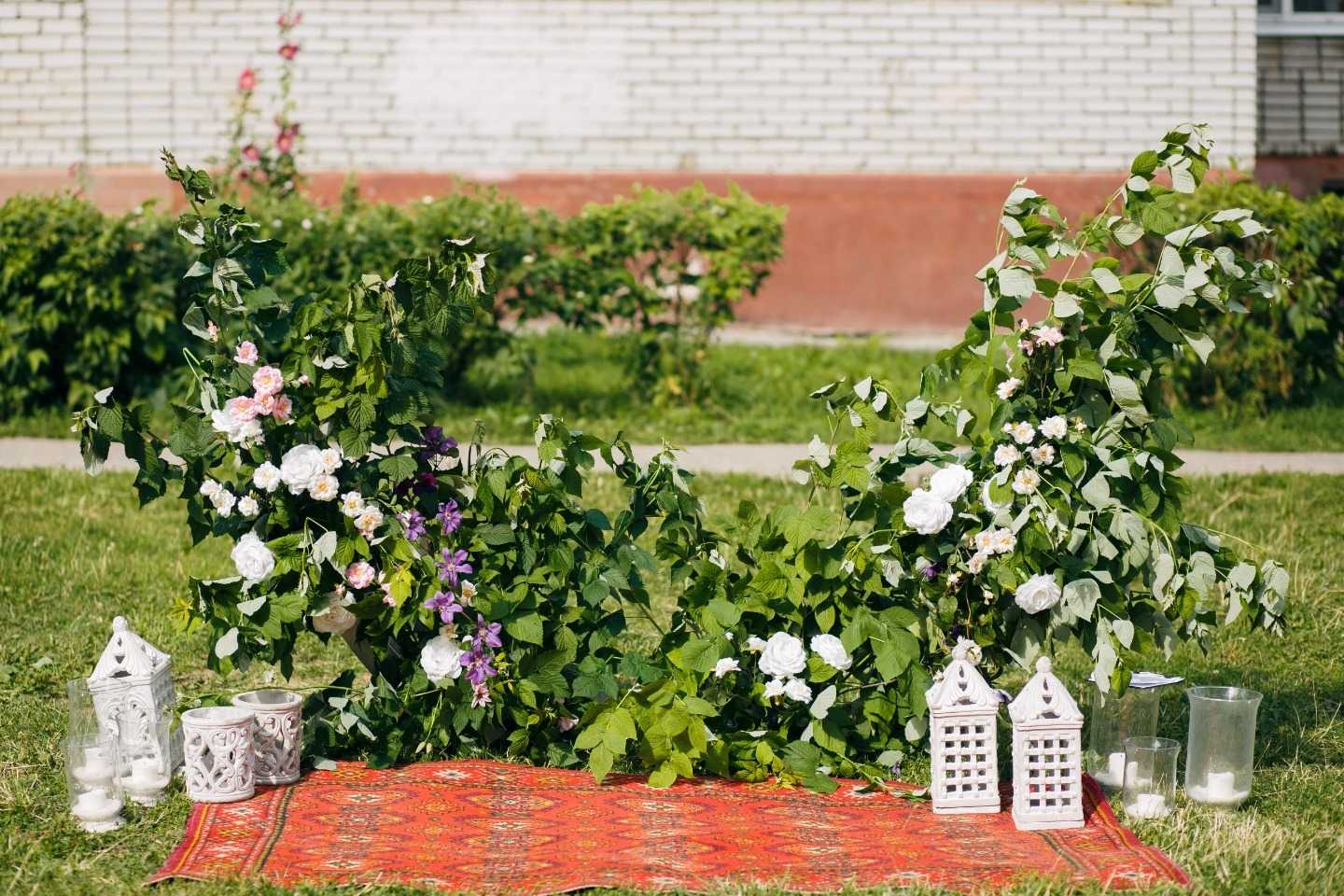 У жениха был довольно удобный образ для развлечений с друзьями во дворе: брюки, жилет, рубашка, кеды. У невесты – нежное платье на бретелях и джинсовка сверху. Длинная фата была видна всем соседям с самых верхних этажей. Зона церемонии была выделена классными коврами и цветочными композициями из садовой зелени. Самым ярким декором во время выездной регистрации стали серые фасады высоченных домов и множеством «подглядывающих» из окон.
