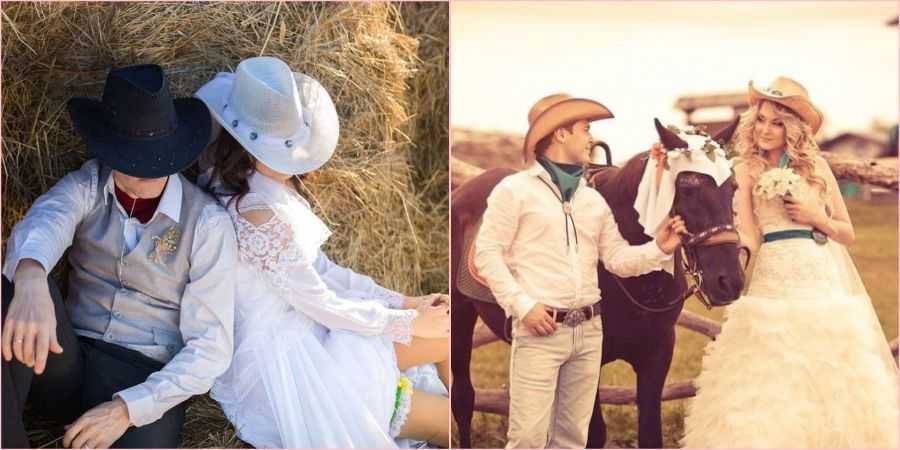 Для наряда невесты подойдет короткое платье с кожаными шнурками на корсете или сарафан. Еще больше передать нужный образ поможет шляпа, джинсовая жилетка и стильные ковбойские сапожки.