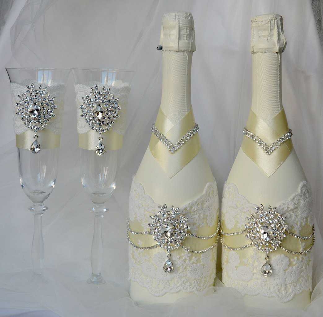 При работе можно сочетать несколько техник оформления свадебных бутылок, но желательно чтобы они сочетались с бокалами и общей тематикой праздника.