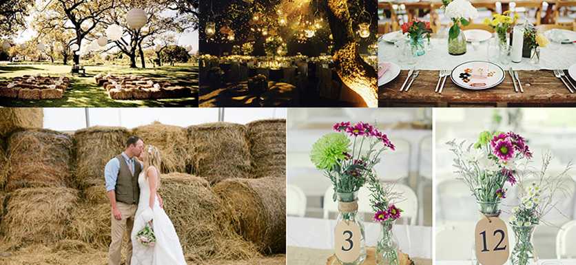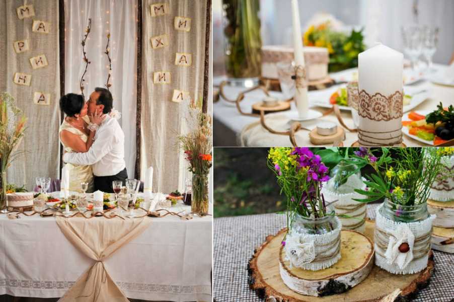 Обязательными атрибутами рустик свадьбы уже стали необработанная холщовая ткань и деревянные аксессуары. Мох, сено, листья, желуди, шишки, хвоя, галька, вязаные изделия, старинные вещи будут прекрасным дополнением в декоре свадебного интерьера.