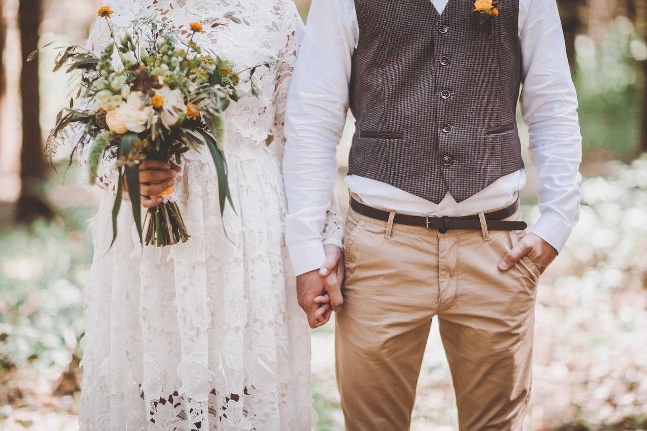 Жених может облачиться в добротный льняной костюм, или даже ограничиться светлой рубашкой в сочетании с жилетом, а брюки заменить джинсами. Галстук-бабочка придаст образу озорства, а вместо модных остроносых туфель приятно будет надеть мокасины или даже кеды.