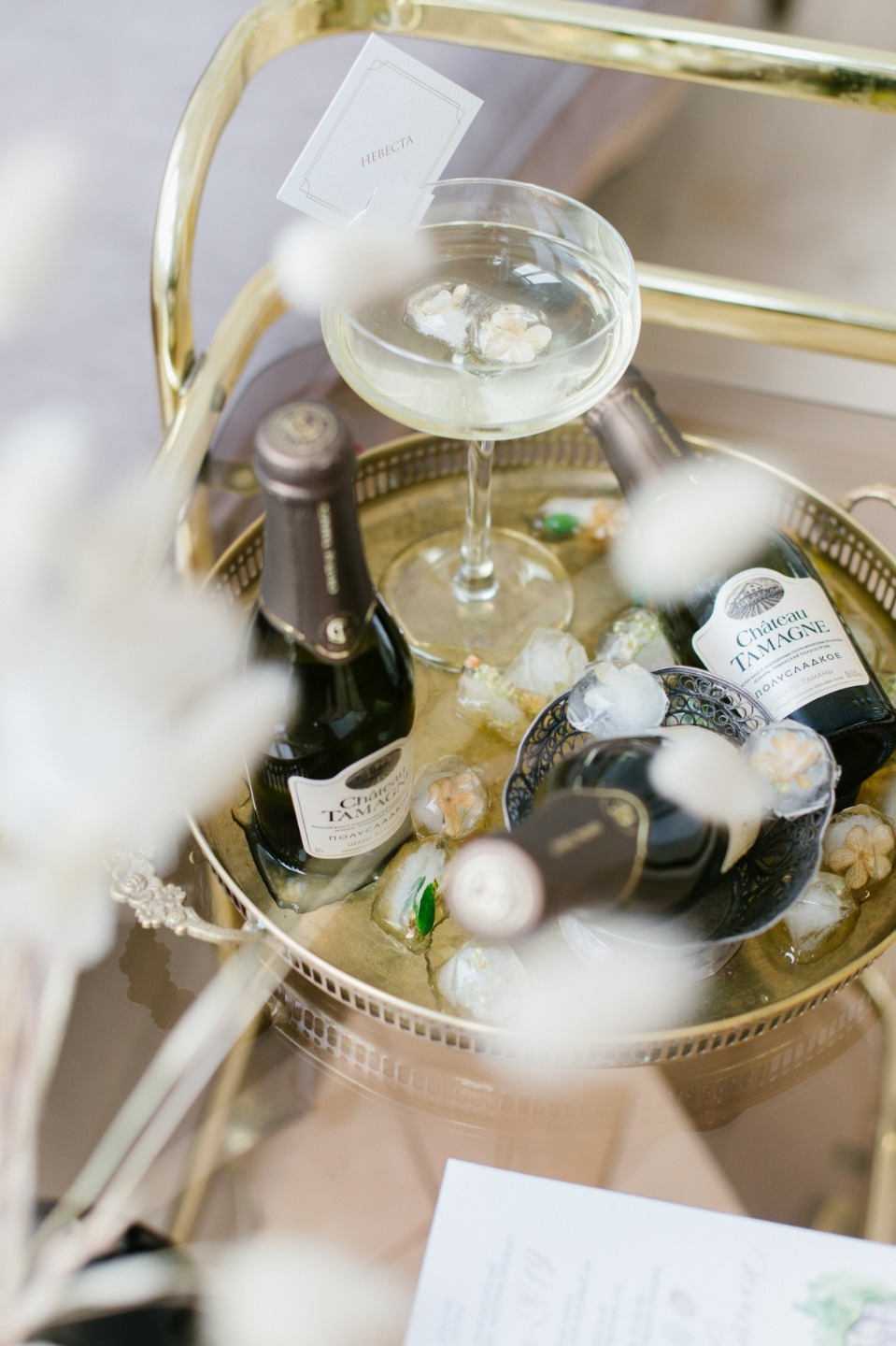 На столах, за которыми будут сидеть гости и молодожены, должны присутствовать высокие вазы с живыми цветами. Дополнительно здесь можно разложить жемчужные нити или броши. Хорошо, если получится достать фарфоровые сервизы и серебряные столовые приборы.