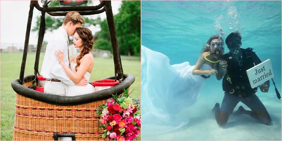 Если в жизни не хватает экстрима, и Вы давно мечтали спрыгнуть с парашютом, прокатиться на воздушном шаре или погрузиться под воду, то почему бы не воплотить это в жизнь на собственную свадьбу. Такой вариант точно запомнится Вам надолго и, возможно, войдет в привычку на каждую годовщину бракосочетания пробовать что-то новое и экстремальное.