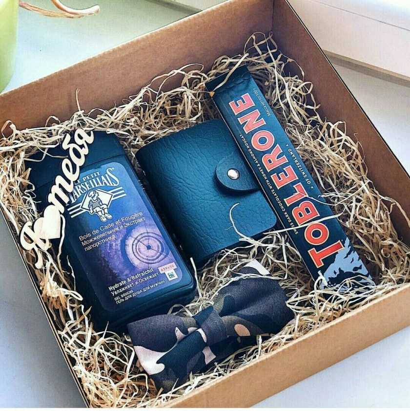 Для второго варианта подарка нам понадобится: деревянный ящик, ароматизатор для машины, красивый бумажник или ключница, флешка с его любимой музыкой. Собираем подарок по такому же принципу.