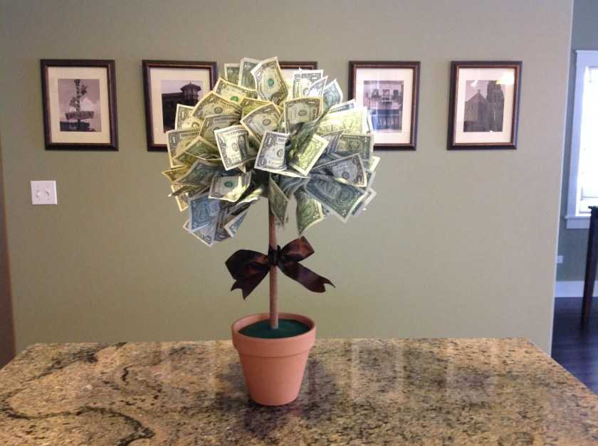 - Денежное дерево. В качестве идеи подойдет любое растение, но можно выбрать декоративный сувенир. На каждую веточку крепятся деньги, а при дарении желают, чтобы тысячи выросли до миллиона.