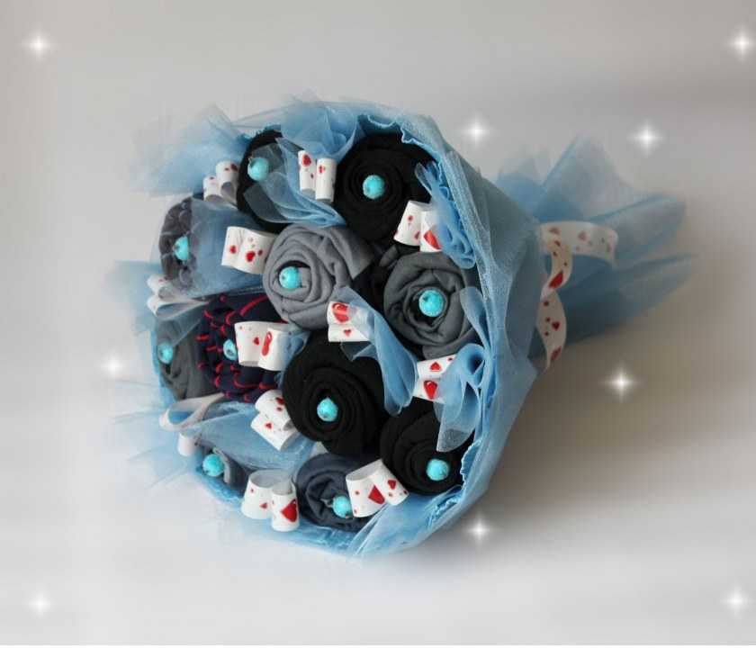 Чтобы наш подарок смотрелся симпатичнее, заворачиваем букет также в бумагу из крафта. Крафт идеально подходит для брутальных мужчин. Напоследок, обвязываем букет атласной лентой. Классный, вкусный мужской букет готов!