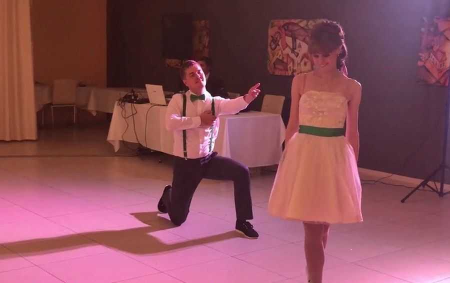 Танец-сюрприз – это необычная постановка, которая порадует гостей мероприятия, позволит новобрачным весело открыть танцевальную программу красивого праздника. Чтобы создать подобное представление, необходимо сделать нарезку любимых песен, придумать интересные движения, все их хорошо отрепетировать. Смотрите видео прикольного танца, где жених с невестой великолепно танцуют под попурри из разных песен – от восточных мелодий до электронного тектоника.