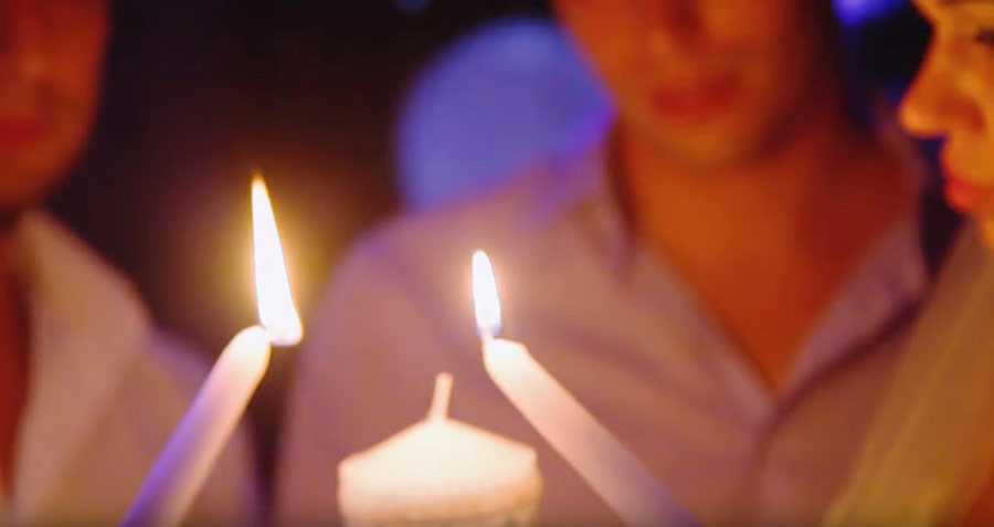В зале можно погасить свет, а всем гостям, ставшим по кругу, раздать и зажечь свечи.